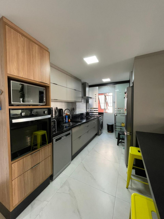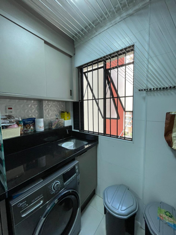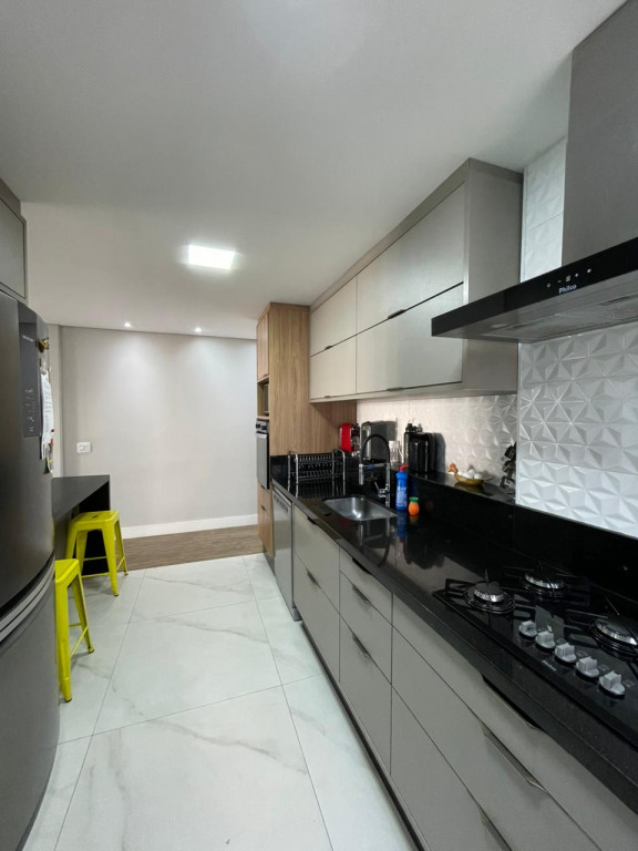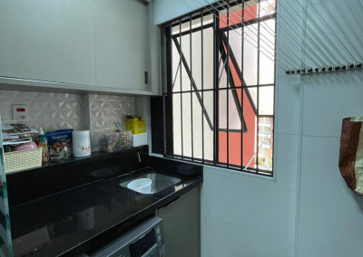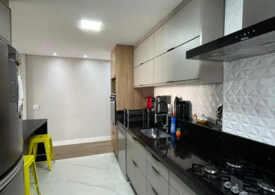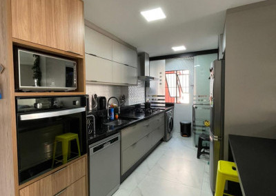 São três dormitórios, sendo um deles suíte, a cozinha é tipo americana com divisória para a lavanderia