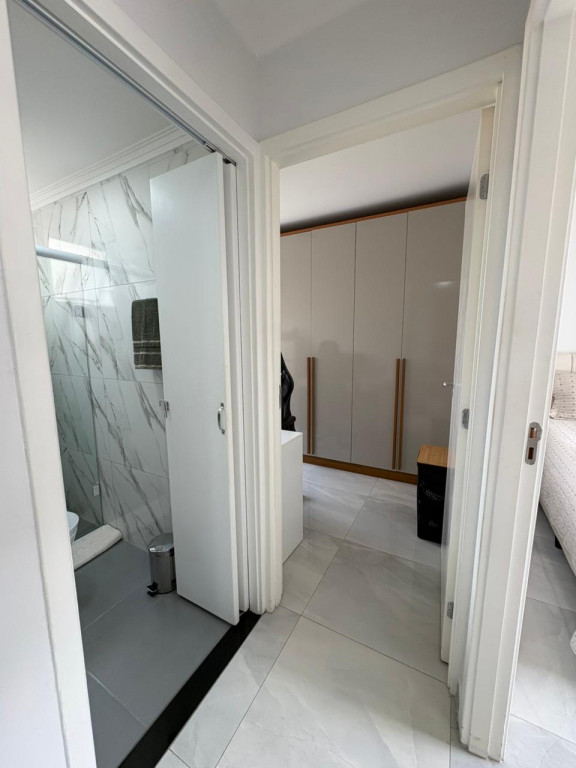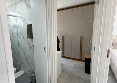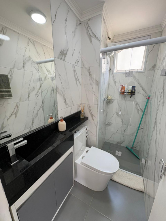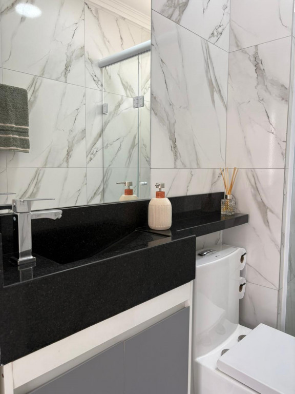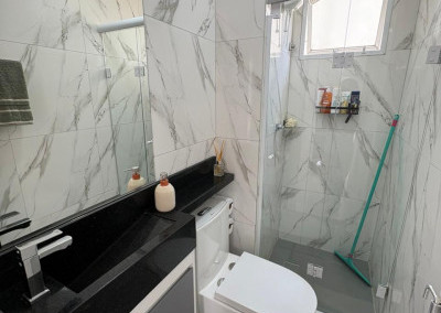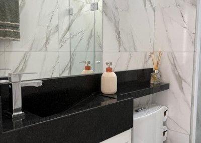 O banheiro é inteiro revestido em mármore e granito, os móveis também são planejados