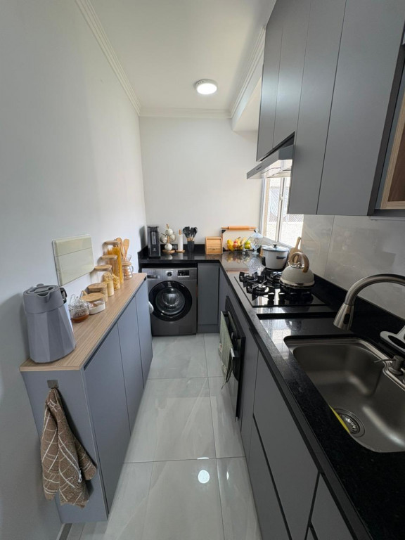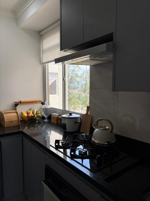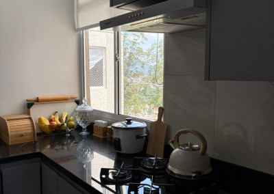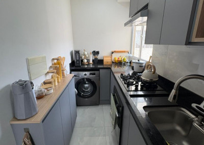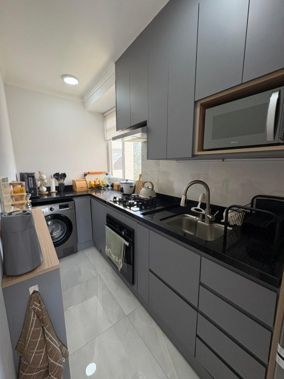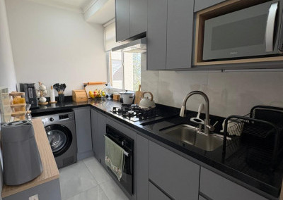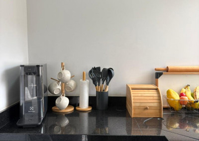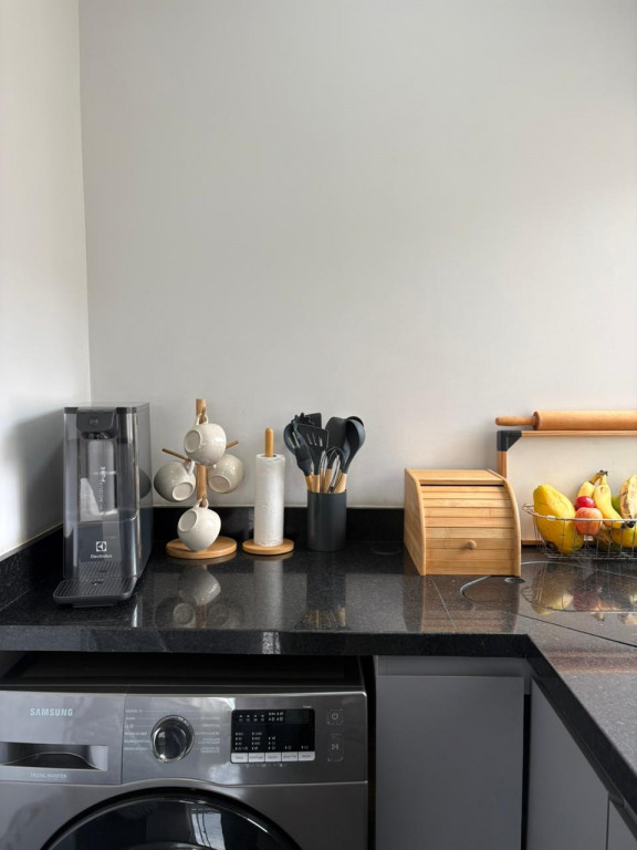 A cozinha foi toda projetada com móveis planejados de alta qualidade, pensando na otimização de espaço e praticada de do dia a dia, a lavanderia é embutida com pedra de mármore, disfarçando o ambiente