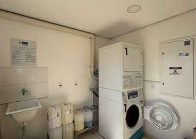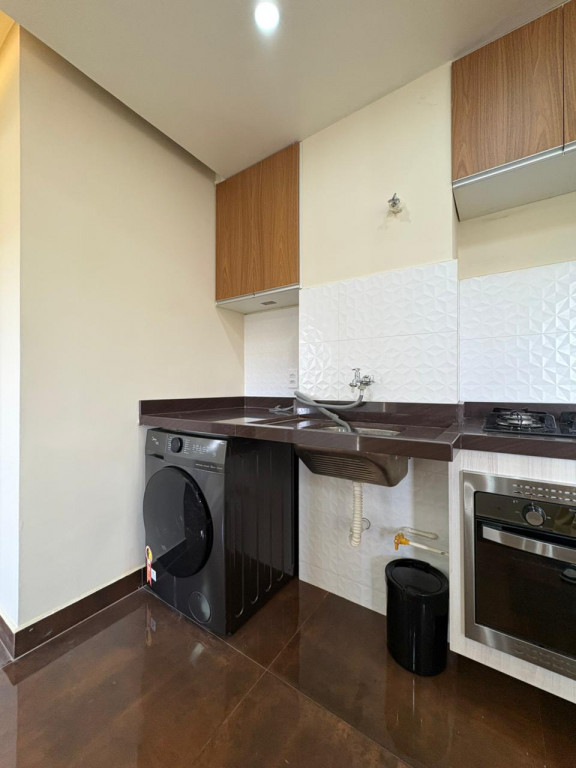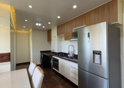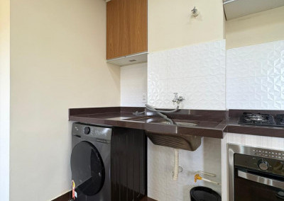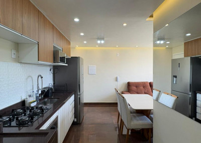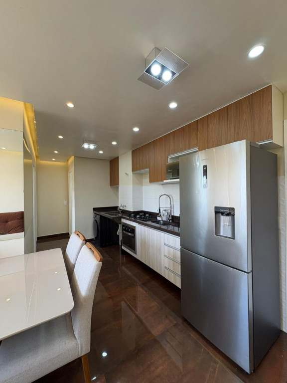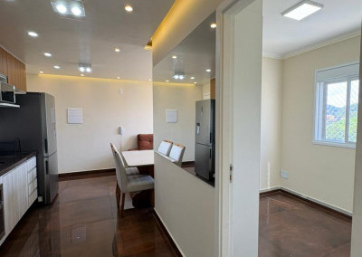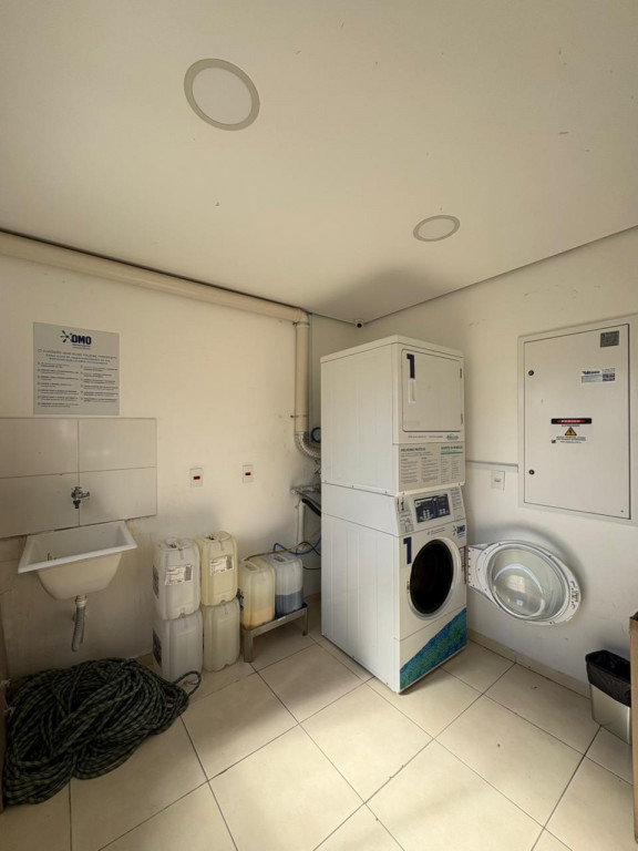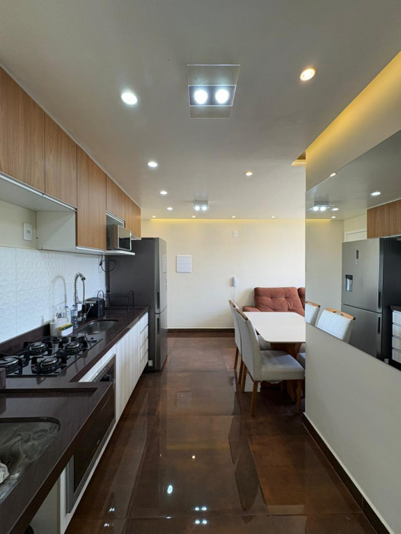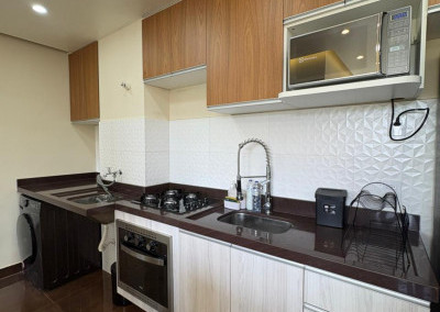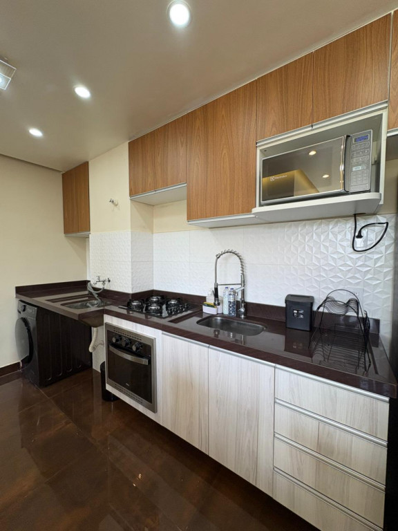 A cozinha é completa, com eletrodomésticos inclusos na venda, sendo geladeira, microondas, cooktop e forno elétrico e máquina de lavar “lava e seca”